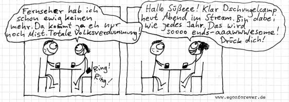 Zum Thema in dem anderen Thread: Ich weiß selbst nicht, warum ich die Sendung unterhaltsam finde, aber sie ist es einfach. Schau das ganze Jahr kein RTL 2 und auch keine der Sendungen auf RTL, aber die kann man auch einfach nicht mit dem Dschungel vergleichen.