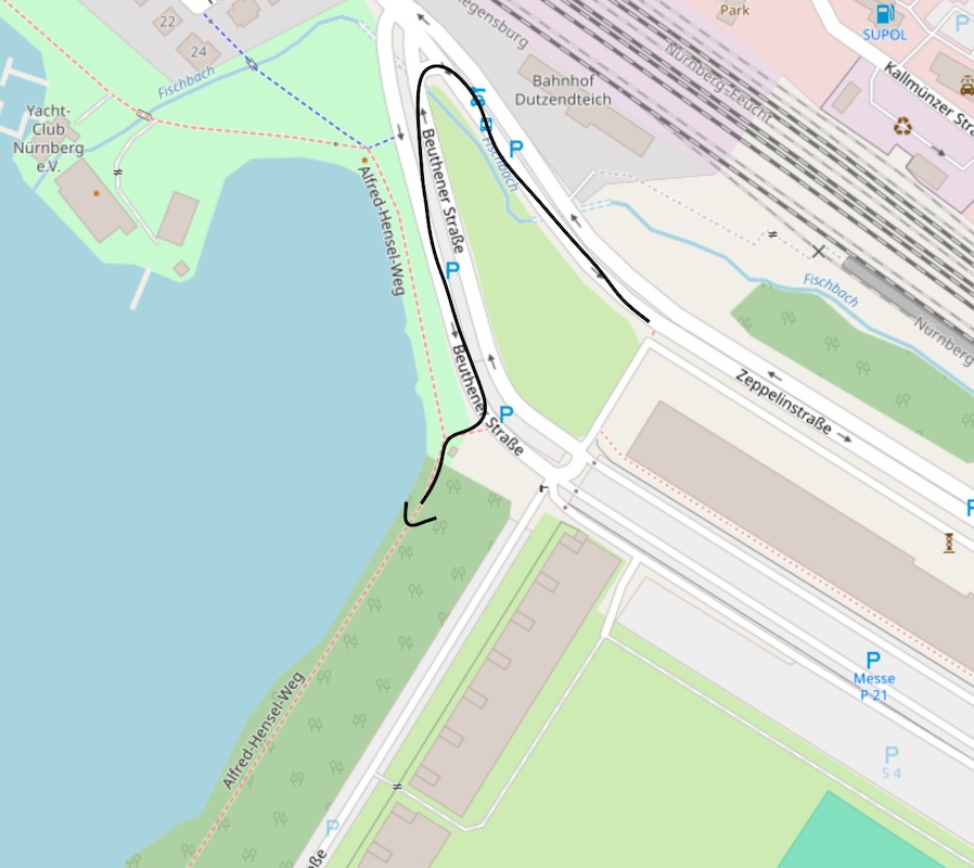 Wenn man auf der Beutender Straße steht ist LIDL in der Regensburger Staße deutlich näher, zum PR-Treffen ist es dann entfernungsmässig egal ob man via Steintribühne - Alfred-Hensel-Weg läuft oder durch den Weg an der Bushaltestelle "Frankenstadion" zur Hans-Kalb-Strasse und dann um Stadion + Stadion-Bad herum zur Großen Strasse.