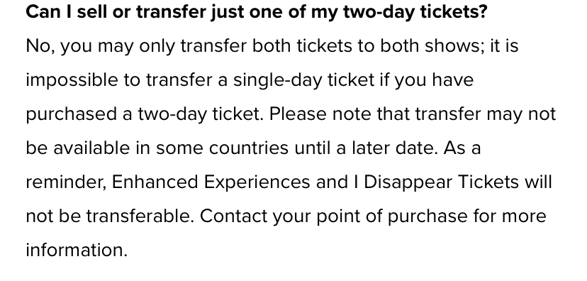 - Scheinbar kein Ticket Transfer für einzelne Tage (Ich verstehe ja, dass sie zunächst im Paket verkaut werden, einfach auch, weil somit bei festen Sitzplätzen in Stadien kein Chaos beim Verkauf entsteht, aber riskieren sie wirklich einige Leere Plätze an manchen Tagen ? Wohlgemerkt sind dennoch einige Konzerte unter der Woche und Sonntags...)