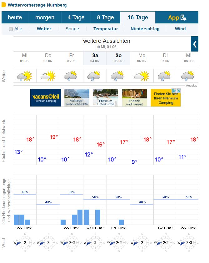 Wenn jetzt des Wetter die nächsten Tage hier in Nürnberg scheiße ist. Ist die Wahrscheinlichkeit doch recht hoch dass das Wetter dann in 2 Wochen echt schön und heiß ist