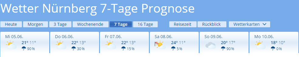 Bei mir sagt wetter.com pünktlich ab Donnerstag jeden Tag Regen![]()